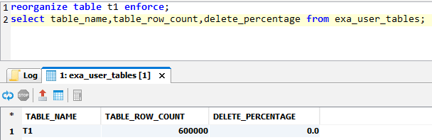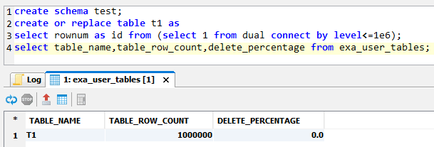 Exasol offers CREATE OR REPLACE TABLE and the DELETE_PERCENTAGE is zero after the table is created. The TABLE_ROW_COUNT is maintained automatically after each data manipulation language (DML) – there’s no need to gather statistics.